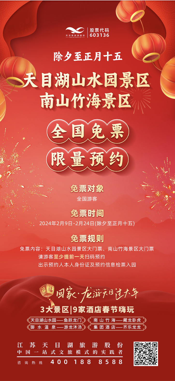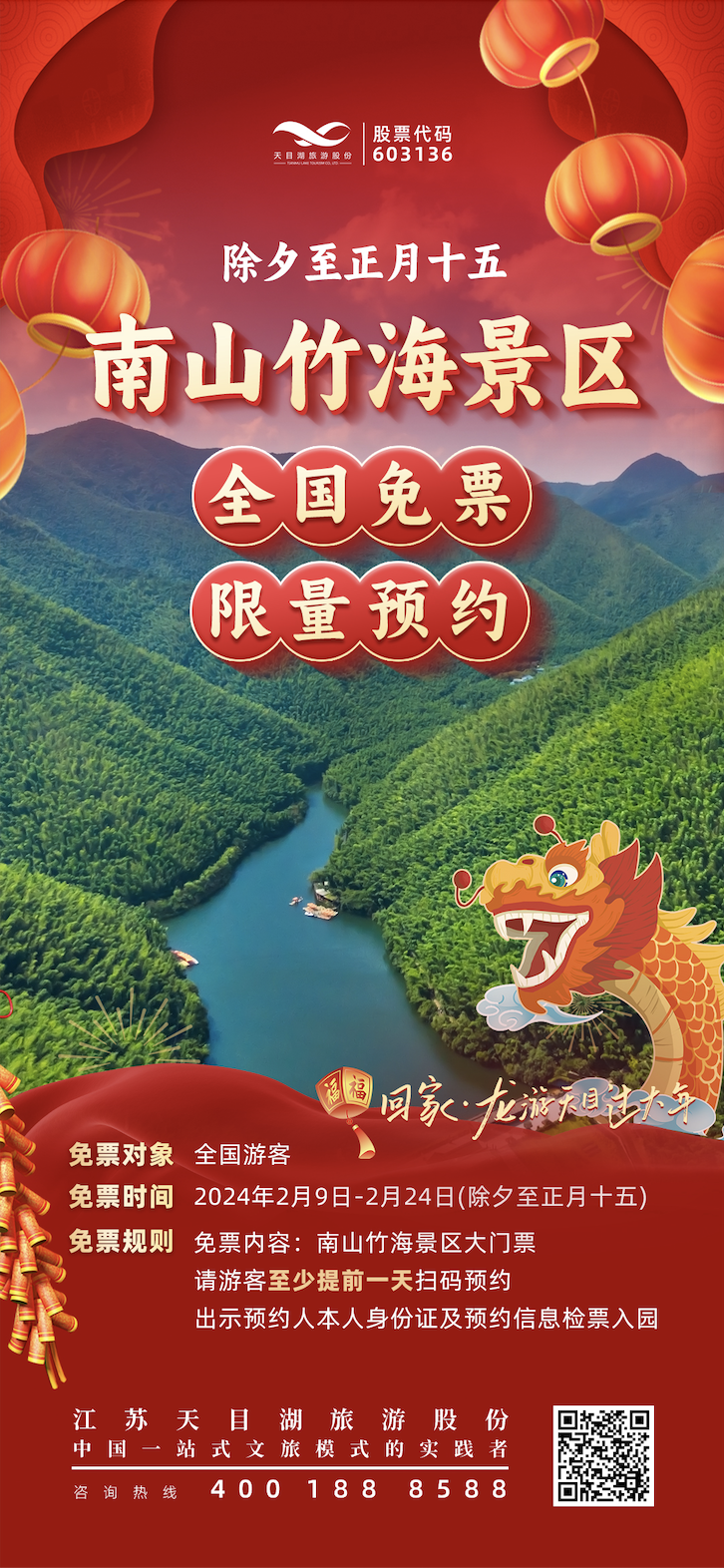 为丰富新年文化和旅游生活,满足人民群众对旅游休闲的需求,推动文化和旅游消费发展,共同营造欢乐喜庆的节日氛围。2024年春节2月9日-2月24日,恒峰g22旅游旗下两大国家5A级景区恒峰g22山水园南山竹海,面向全国游客开展免门票政策。奏折盖章、非遗大戏、龙灯巡游、江湖奇市、仙子六礼……一场龙年新春盛宴正等待您来开启!